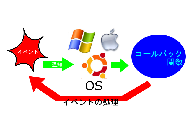イベントが発生すると、OSがアプリケーションの用意したコールバック関数を呼びます。