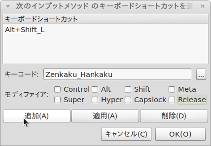 キーコード欄の右の「…」をクリックして、開いたダイアログで「半角/全角」キーを押下します。