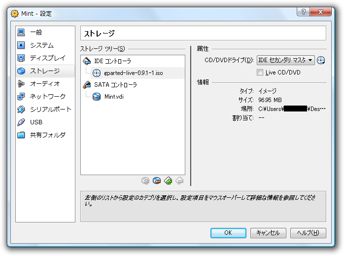 HDDの場所… C:\Users\ユーザー\VirtualBox VMs\Mint\