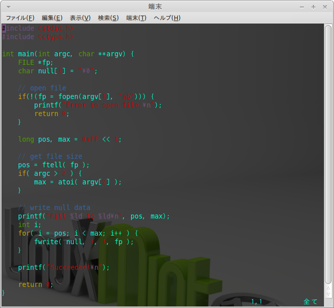 あ、ソースファイルの名前はfat.cにしておきました。こういうファイル肥大化ソフトは
